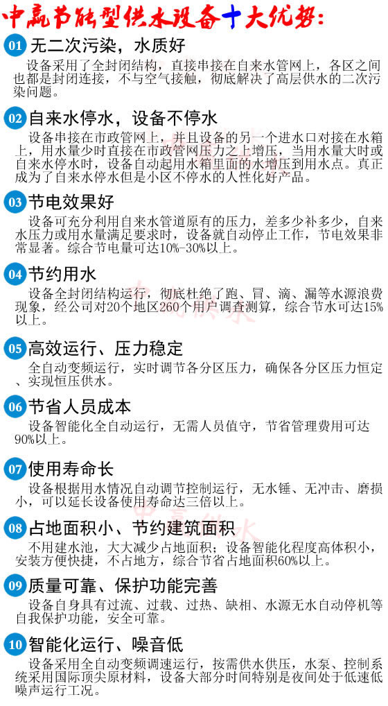 1、  設備直接串聯在自來水官網上,不用建水池,節約大量土地和資金。